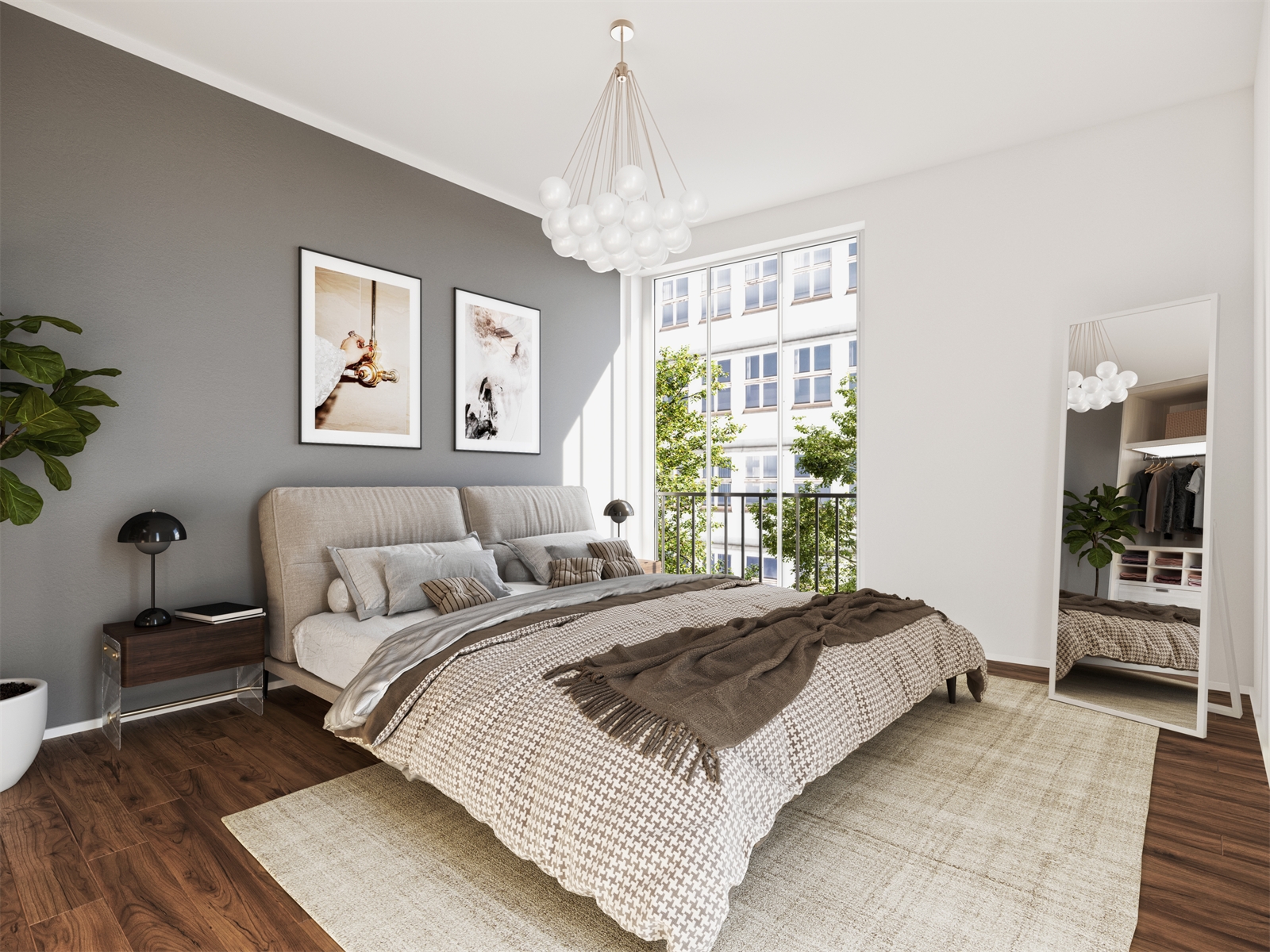 Die großzügige Verglasung der Wohnungen besteht aus Isolierglas-Fenstern mit einem U-Wert bis 0,6 W/m³K und die Fensterrahmen bis 1,1 W/m³K. Die Wohnungsfenster erhalten Pilzkopfverriegelung und abschließbare Fenstergriff-Oliven. Zusätzlich werden elektrisch bedienbare außenseitig liegende Sonnenschutzrollos zur Verdunkelung mit Zip-System installiert.