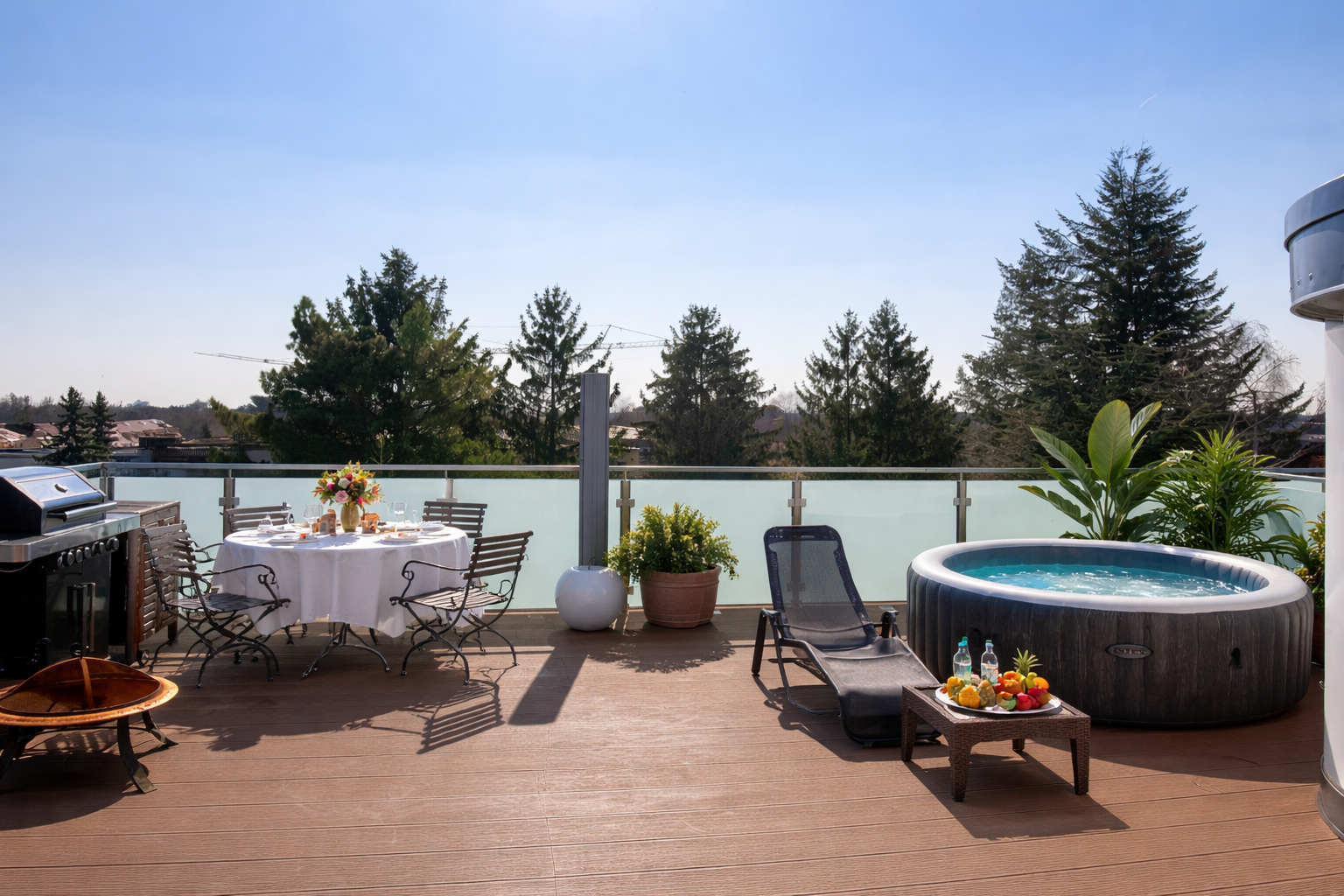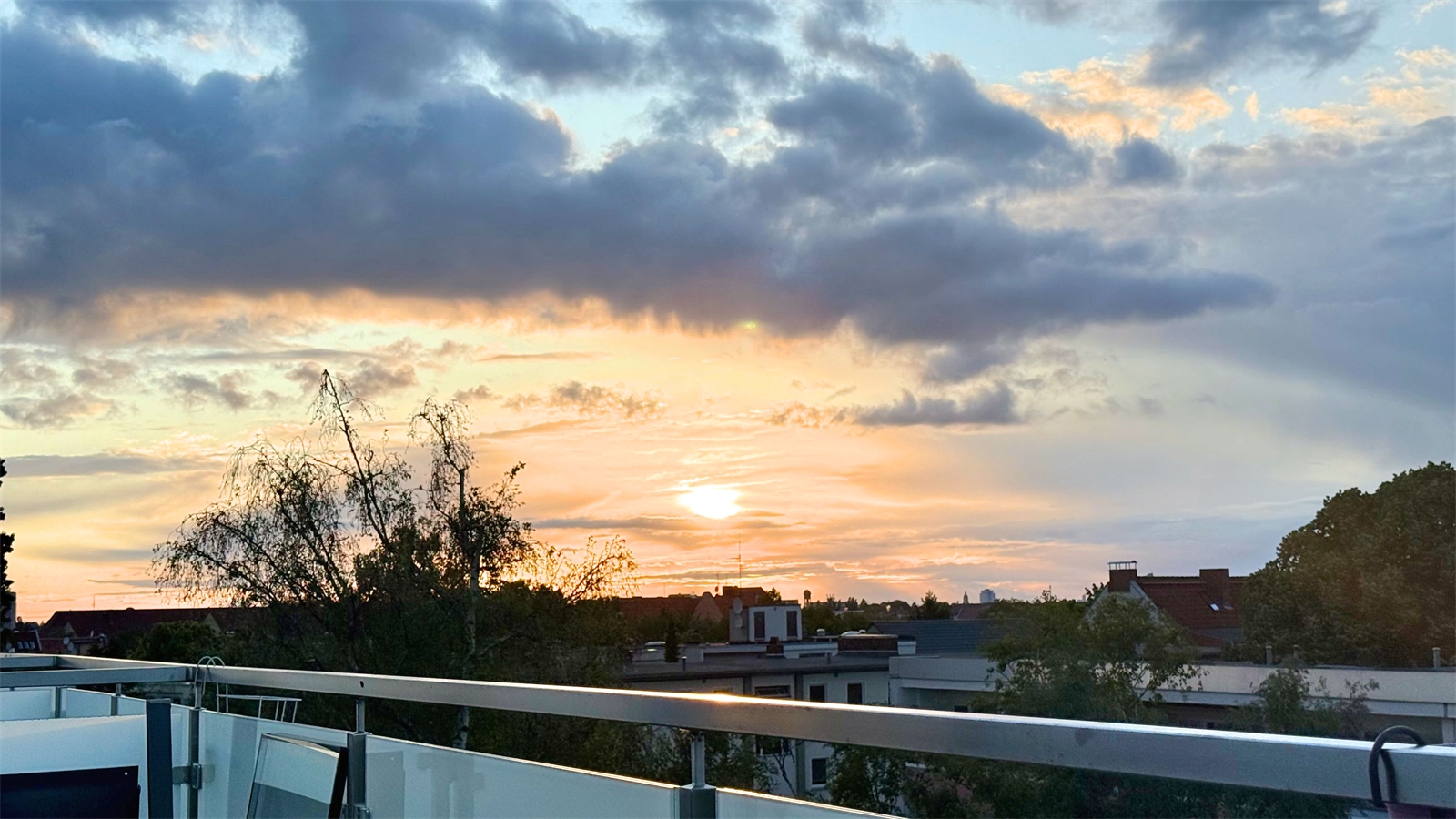 Ein echtes Highlight ist die großzügige Aufdachterrasse, die über das Treppenhaus erreichbar ist. Sie vermittelt das Gefühl eines „Hauses im Haus“ und bietet als weitgehend uneinsehbarer Rückzugsort mitten in der Stadt ein besonderes Maß an Ruhe und Privatsphäre. Ob Sonnen, Essen im Freien oder entspanntes Verweilen – hier entsteht ein außergewöhnlicher Außenbereich mit echtem Mehrwert. Die umlaufende Verglasung unterstreicht das offene Raumgefühl und sorgt zugleich für angenehme Sicherheit.