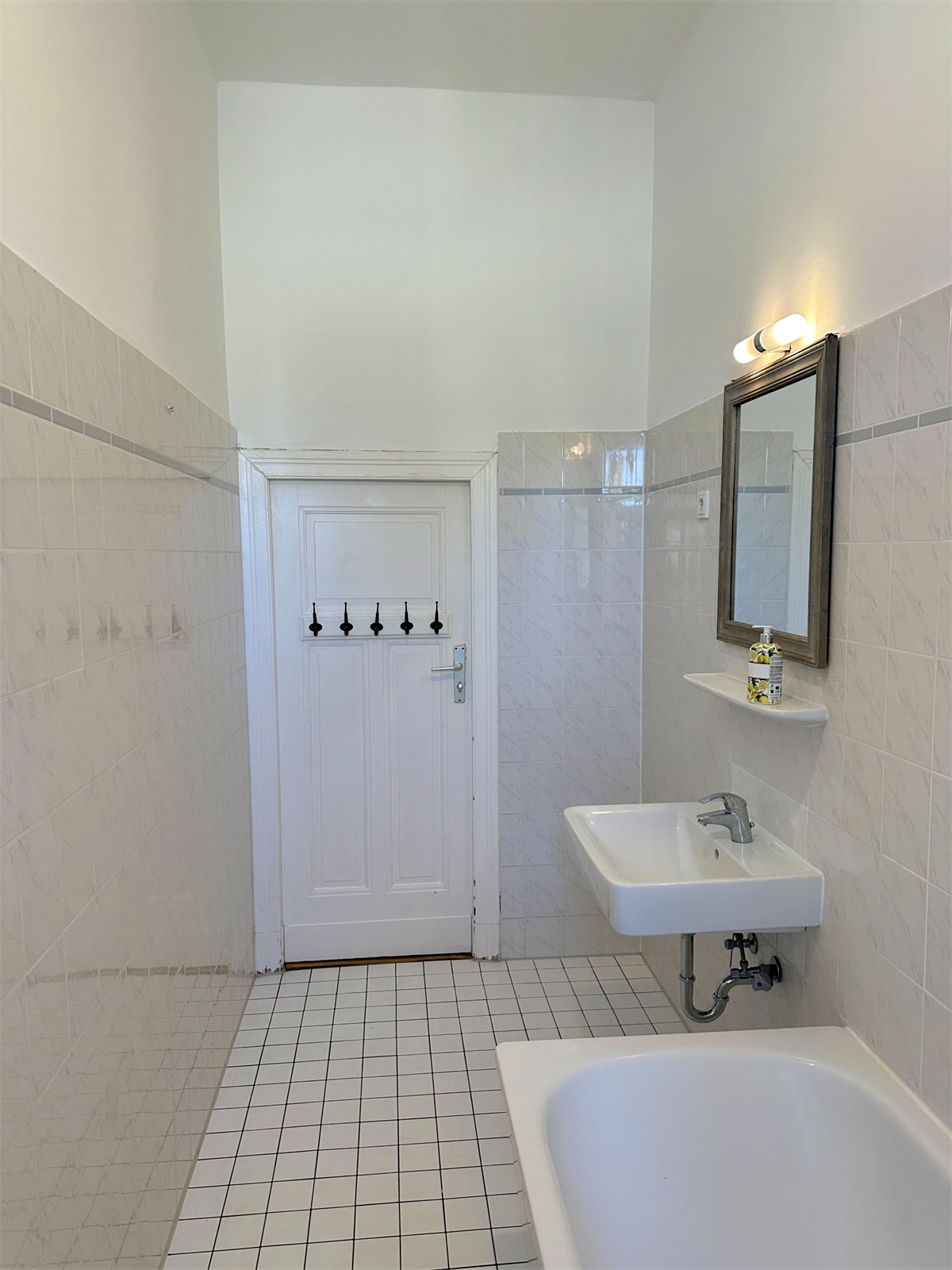 Das Tageslichtbad, ausgestattet mit, Badewanne, Waschbecken und WC, sowie Waschmaschinenanschluss, ist in freundlichen, hellen Tönen gefliest und unterstreicht das angenehme Wohngefühl.