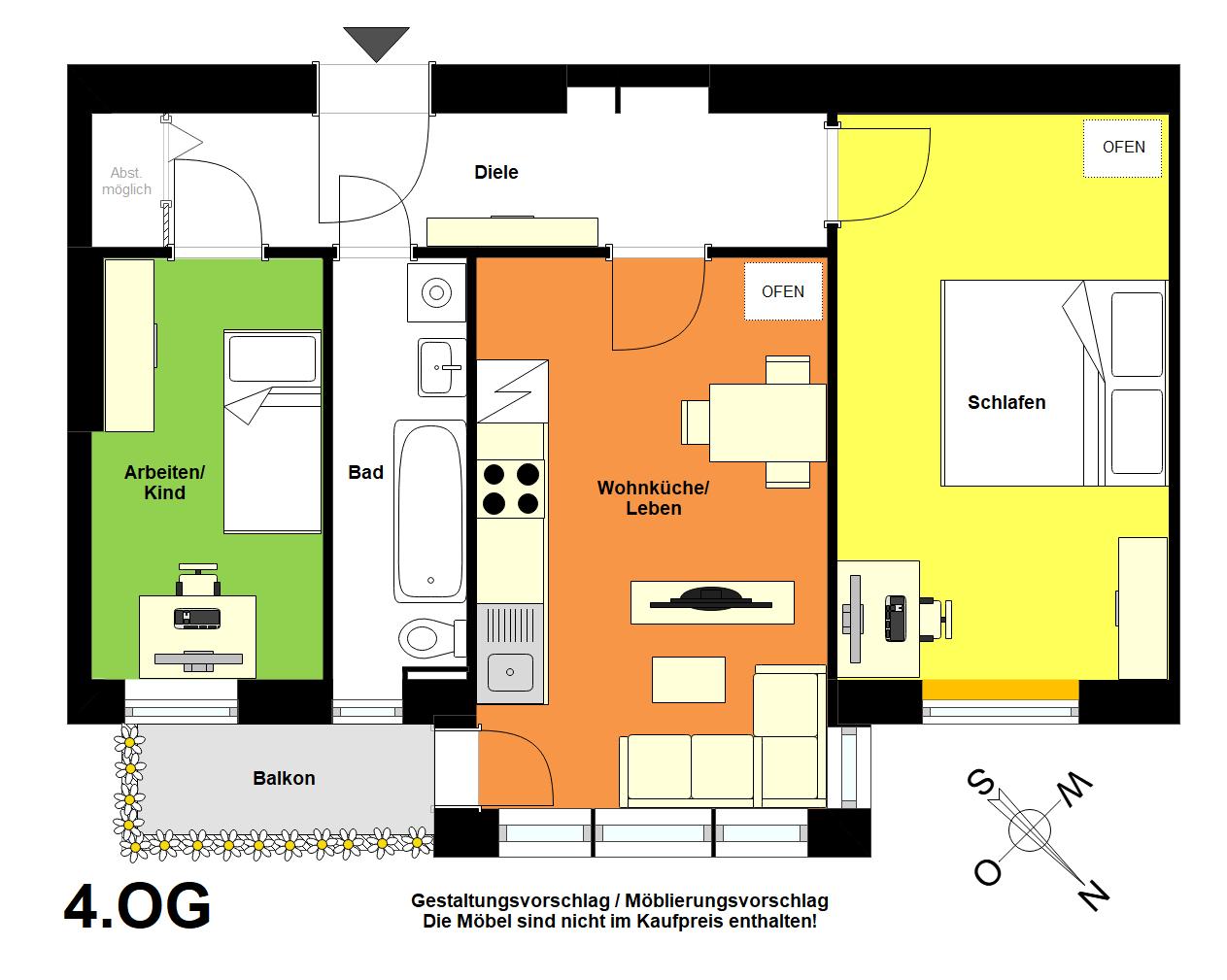 Die bestehende Küche kann je nach Wunsch dort bleiben oder als offene Küche im Wohnzimmer vom Käufer eingerichtet werden. Die Anschlüsse hierfür sind im Wohnzimmer vorhanden.
