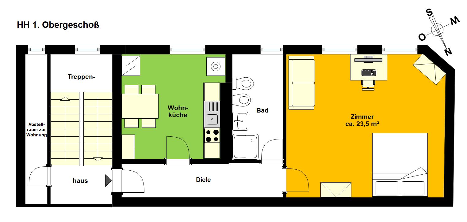 Der Grundriss ist praktisch geschnitten: Über die Diele gelangen Sie in alle Räume – die helle Wohnküche, das Bad sowie das großzügige Zimmer. Wohnzimmer, Flur und Küche sind mit gepflegtem Fertigparkett ausgelegt und sorgen für eine warme Atmosphäre.