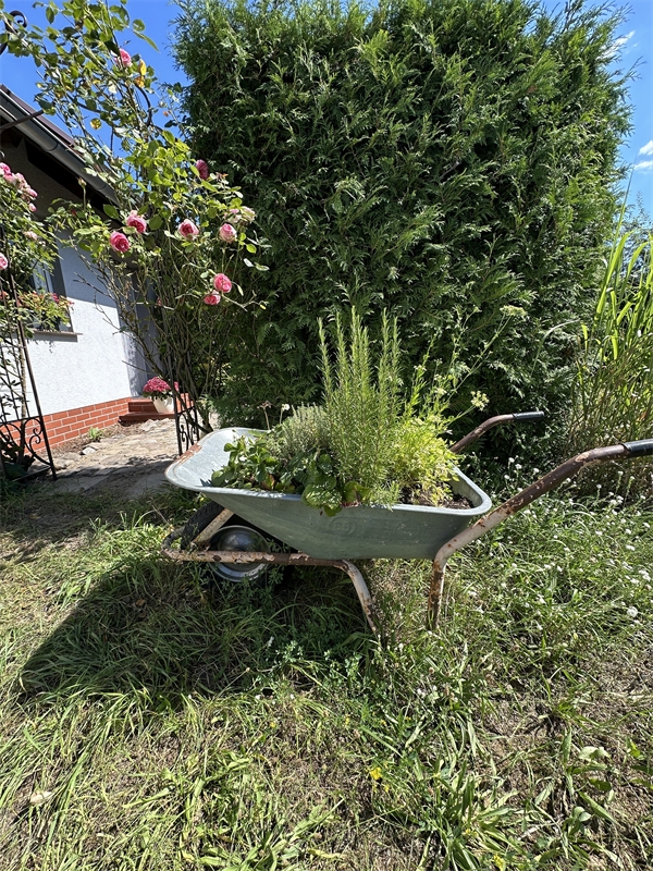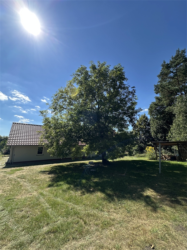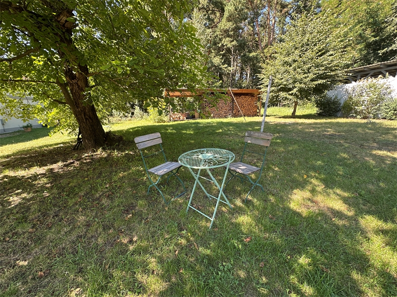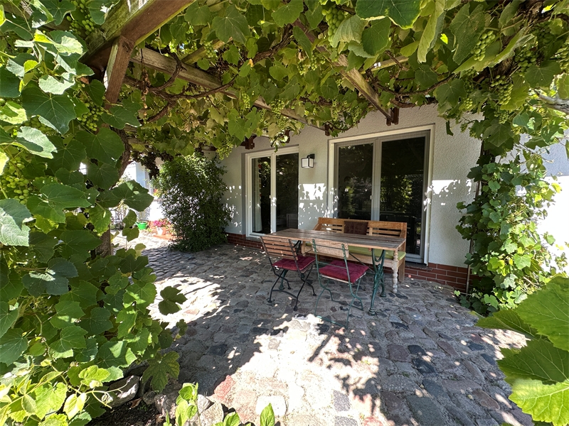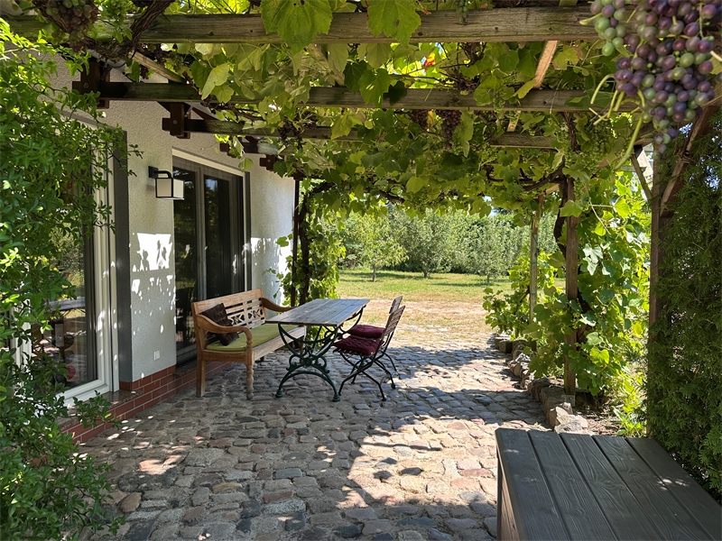 Und für die schönen Sommertage: Direkt am Haus lädt eine naturgewachsene Weinpergola zum Verweilen ein – ein idyllischer Platz im Schatten, an dem man die Ruhe und Weite des Grundstücks genießen kann.