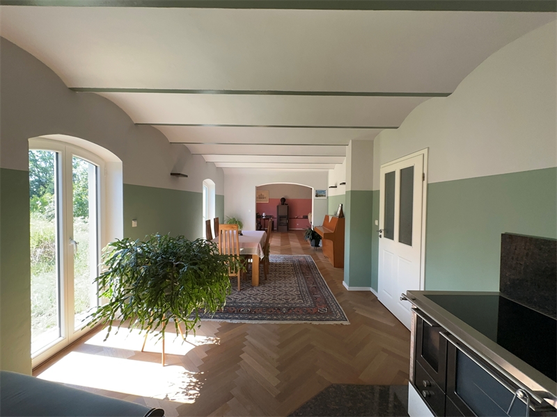 Dank neuer, teilweise bodentiefer ISO-Holzfenster sind die Räume lichtdurchflutet und öffnen den Blick in die grüne Umgebung. Beheizt wird das Haus mit einer Flüssiggas-Gaszentralheizung – im Altbau mit Fußbodenheizung, im Umbau mit modernen Heizkörpern.