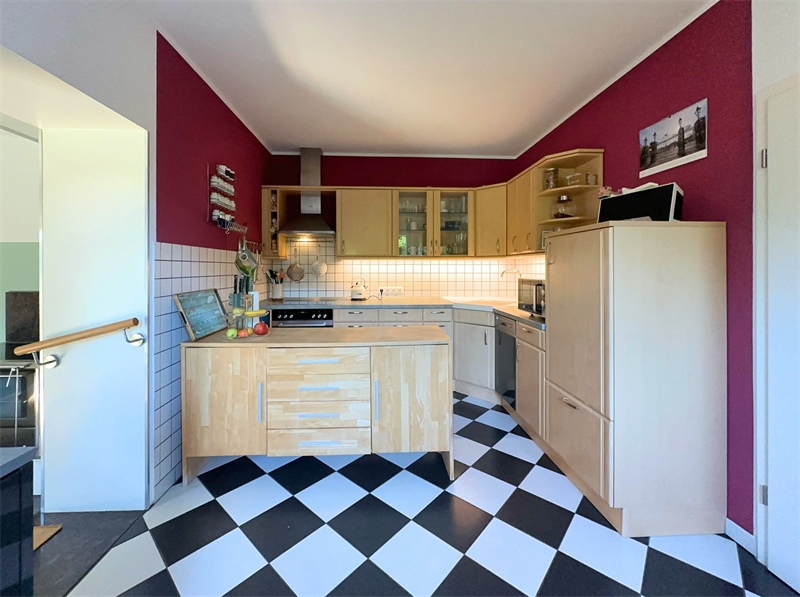 Die Einbauküche ist großzügig ausgestattet: Hier kochen Sie wahlweise klassisch am Induktionsherd oder traditionell und stimmungsvoll an der modernen, holzbefeuerten Kochhexe – ein Highlight für Genießer und Liebhaber besonderer Details.