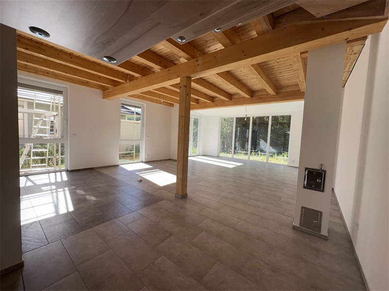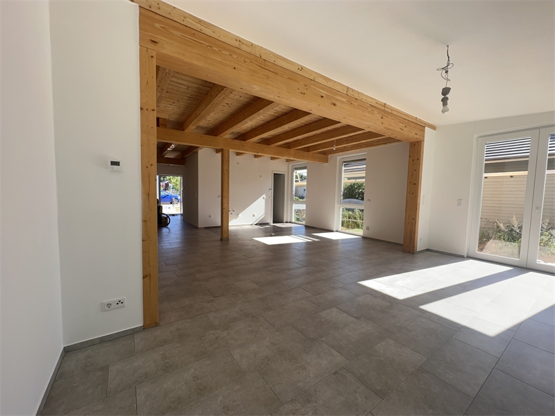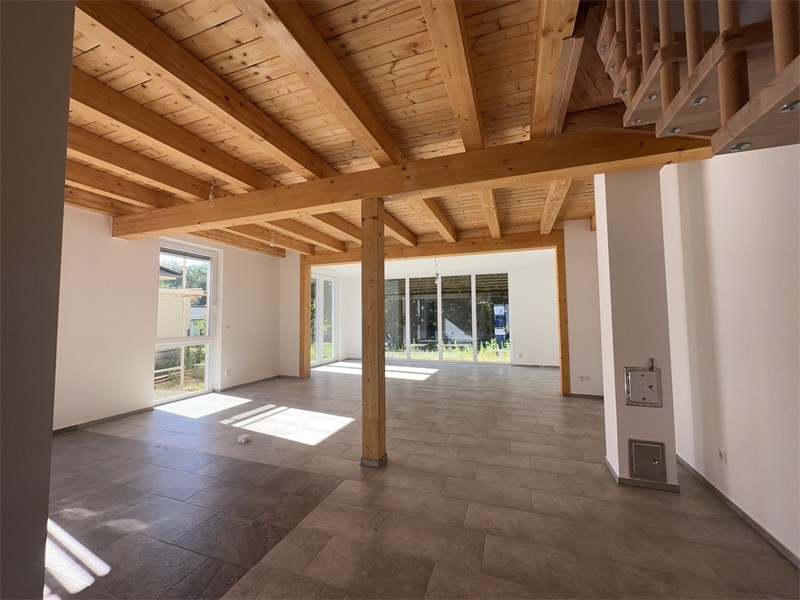 Nach dem Passieren eines einladenden und großzügigen Eingangsbereiches gelangt man in ein weit offenen Wohnbereich mit Sichtholzbalkendecken, einer offenen Küche, einem Zugang zum gärtnerischen Außenbereich und die Anschlussmöglichkeit für einen Kaminofen.