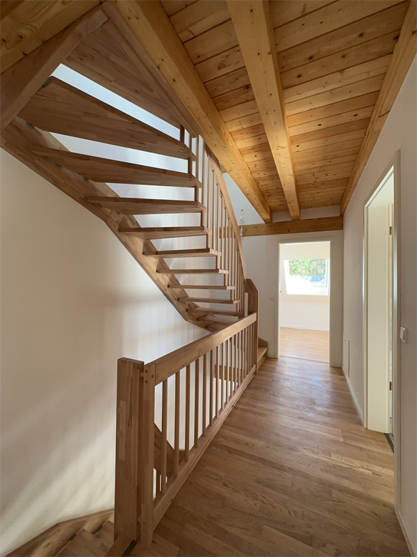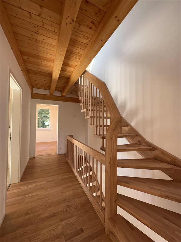 Der Fußboden im Erdgeschoss ist pflegeleicht, wohnlich und ansprechend gefliest. Eine Holztreppe führt in die oberen Etagen. Die Fußböden in den oberen Etagen sind mit Echtholzparkett ausgestattet.Das Haus verfügt somit über insgesamt 4 Zimmer und 2 geräumigen Bädern, welche mit hochwertigen und namhaften Badelementen ausgestattet werden. Die Waschbecken sind aus Keramik, die Badewanne aus Emaille. Die Bäder sind bis zur Türhöhe gefliest und verfügen über ebenerdige Duschen mit Glastüren.