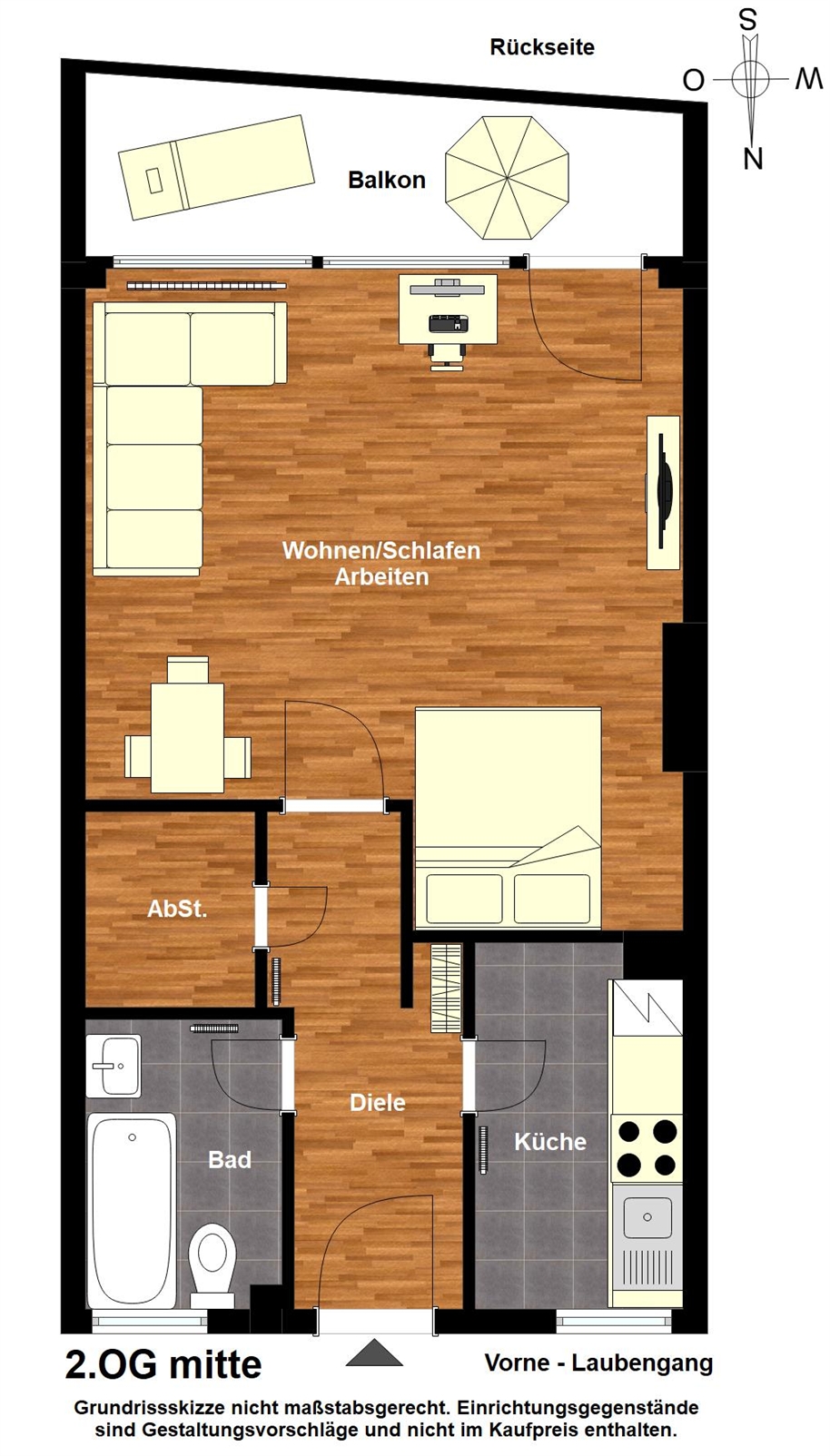 Zur Wohnung gehört eine praktischer trockener Kellerraum.Die im Grundriss abgebildeten Möbel dienen ausschließlich als Einrichtungsvorschläge und sind nicht Bestandteil des Kaufangebotes (Einbauküche ausgenommen).