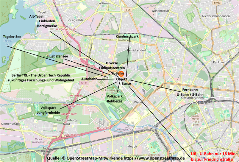 + In wenigen Minuten erreicht; die Autobahnanbindung (A111) Autobahnauffahrt Kurt- Schumacher-Damm, mit Anbindung an die Innenstadt von Berlin, ins Umland und Richtung Hamburg.
