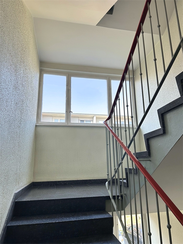 Das gut geschnittene Wohnzimmer hat direkten Zugang zu dem großen Balkon, der sich über die gesamte Breite der Wohnung erstreckt. Die Süd-Ostausrichtung sorgt für viel Licht, während Sonnenschutzrollläden angenehmen Schatten spenden. Der Balkon bietet zudem einen grünen Ausblick – ein echter Rückzugsort mitten im Alltag.