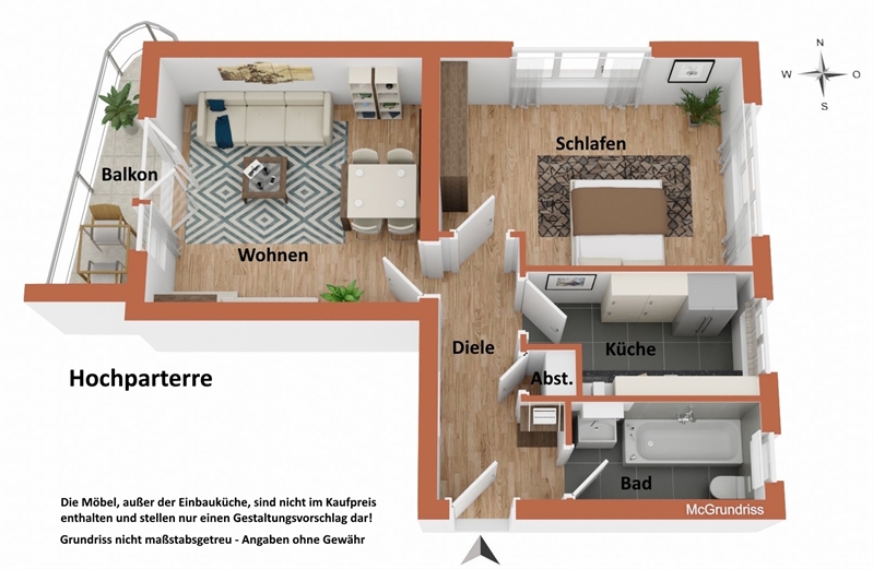 Vom zentralen Flur aus erreichen Sie bequem alle Räume: Wohnzimmer, Schlafzimmer, Küche, Bad – und sogar einen praktischen Abstellraum zwischen Küche und Bad. Während das gemütliche Schlafzimmer zum ruhigen Hinterhof zeigt, genießen Sie im Wohnzimmer den gemütlichen Westbalkon.