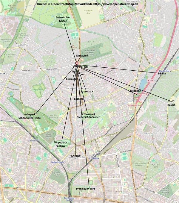 In unmittelbarer Nähe gibt es mehrere Spielplätze und Grünanlagen, die hervorragende Freizeitmöglichkeiten bieten wie zum Beispiel der Brosepark, der Botanischer Volkspark Pankow Blankenfelde und der Naturgarten Pankow, um nur einige zu nennen. Die Umgebung ist geprägt von charmanten Wohngebieten und ruhigen Straßen, was zu einem hohen Lebensstandard beiträgt. Hier können Kinder unbesorgt draußen spielen, während Eltern die Nachbarschaft in aller Ruhe genießen.