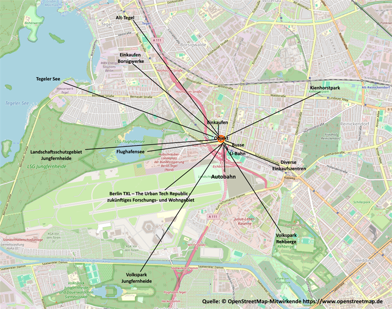 Das Objekt ist auch optimal gelegen, um zum zukünftigen Forschungs- und Wohngebiet – Berlin TXL – The Urban Tech Republic zu gelangen.Darüber hinaus profitieren die Bewohner von einer Vielzahl an Einkaufsmöglichkeiten. In der näheren Umgebung finden sich diverse Supermärkte, Fachgeschäfte und Wochenmärkte, die eine umfassende Nahversorgung garantieren. Auch Restaurants, Cafés und Freizeitmöglichkeiten sind zahlreich vorhanden, was zu einer hohen Lebensqualität beiträgt.